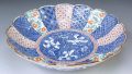 見込み(うつわの底)の中心には染付のブルーで百花の王とされる牡丹が堂々と描かれ、そこから放射状に染付と色絵で縁起の良い古紋や白地をうまく使った果実の絵が描かれています。果物の絵の周囲がまるで額縁に入っているように面白くデザインされ、鮮やかでありながら、調和が取れたバランスの良いデザインになっています。